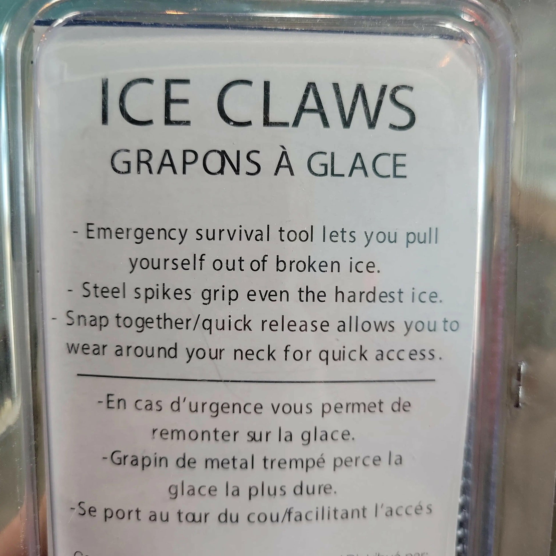 Wear the COMPAC Ice Claws around your neck for added safety and inexpensive security. Snap together and release very quickly and easily. Features two plastic red handles and steel spikes for grip. A simple emergency survival tool all ice fishermen and hunters should carry.