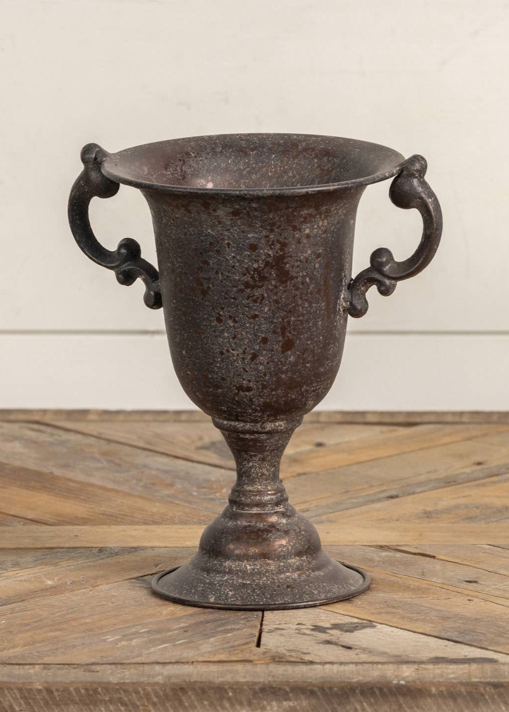 The Beverly Urn brings a touch of European garden elegance to your home. With its gently flared silhouette, curved handles, and distressed finish, this metal urn looks equally beautiful holding fresh blooms, faux greenery, or standing alone as a sculptural accent.