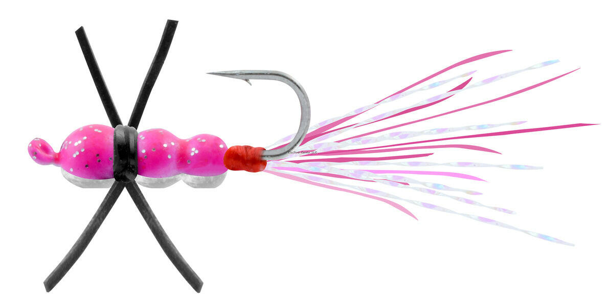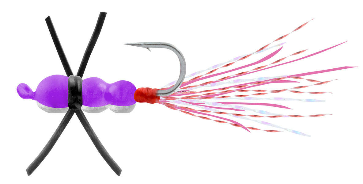 Celsius Lil leggy jig 1/26oz Tungsten body with rubber arms & Mylar/tinsel tail for life-like flash, ultra sharp #6 hook, UV paint, 3 gems.