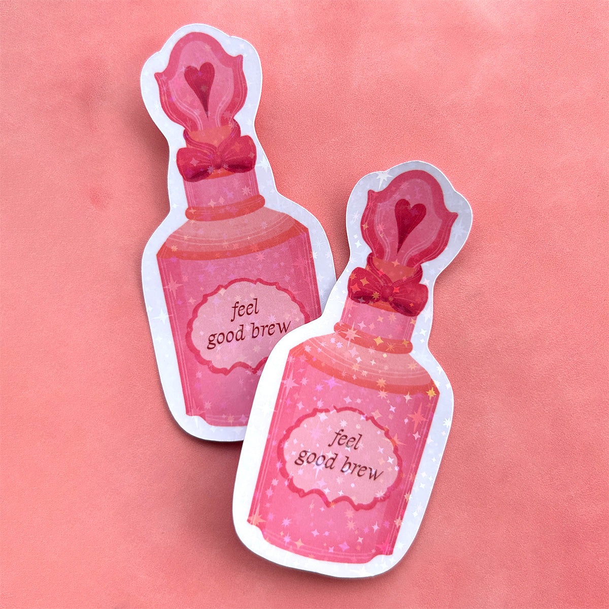Add a sprinkle of good vibes with this Feel Good Brew sticker! Designed to look like a charming vintage perfume bottle, this pink potion is your go-to for an instant mood boost. Whether you're dressing up your water bottle, laptop, or journal, this sticker is here to brighten up your day.