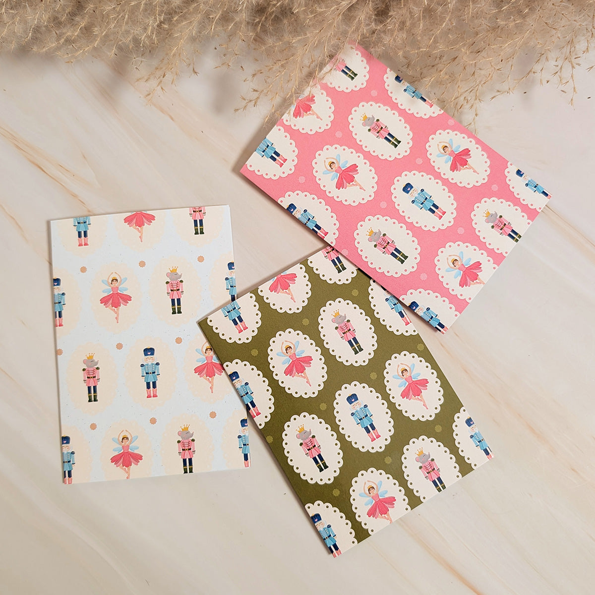 Step into a world of holiday magic with our Festive Nutcracker Friends greeting card, featuring a delightful pattern of the Nutcracker, Mouse King, and Sugar Plum Fairy. Available in green, pink, and white, this whimsical design is perfect for fans of the classic tale and holiday charm alike. Blank inside to let you write your own enchanting holiday message.