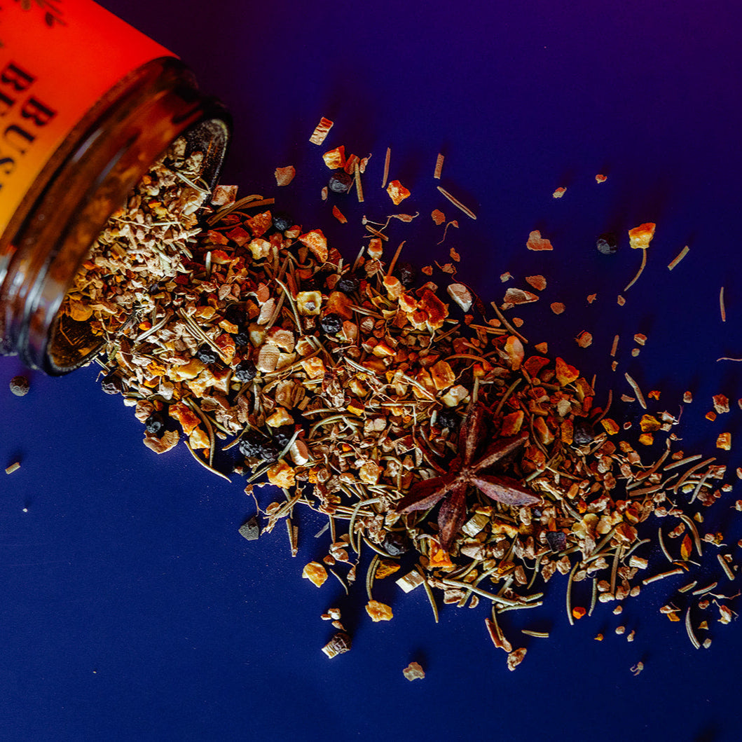 Make your own zesty, immune-boosting elixir with our Fire Cider Kit. This blend includes dried ginger, rosemary, turmeric, peppercorn, astragalus, orange peel, star anise, and cayenne, designed to be combined with fresh garlic, jalapeño, lemon, and onion, then infused in apple cider vinegar.