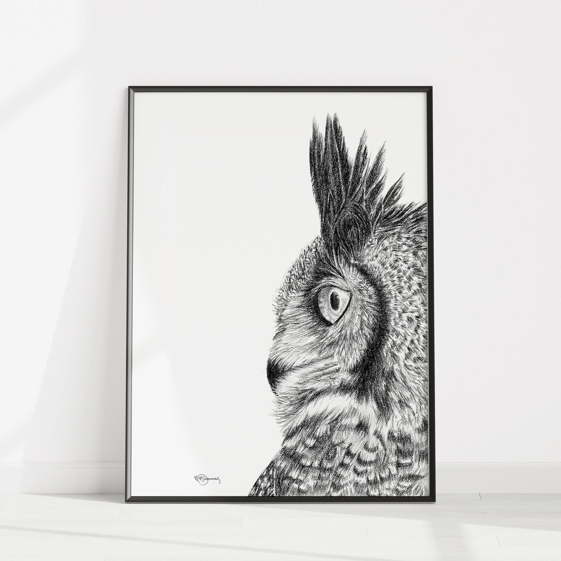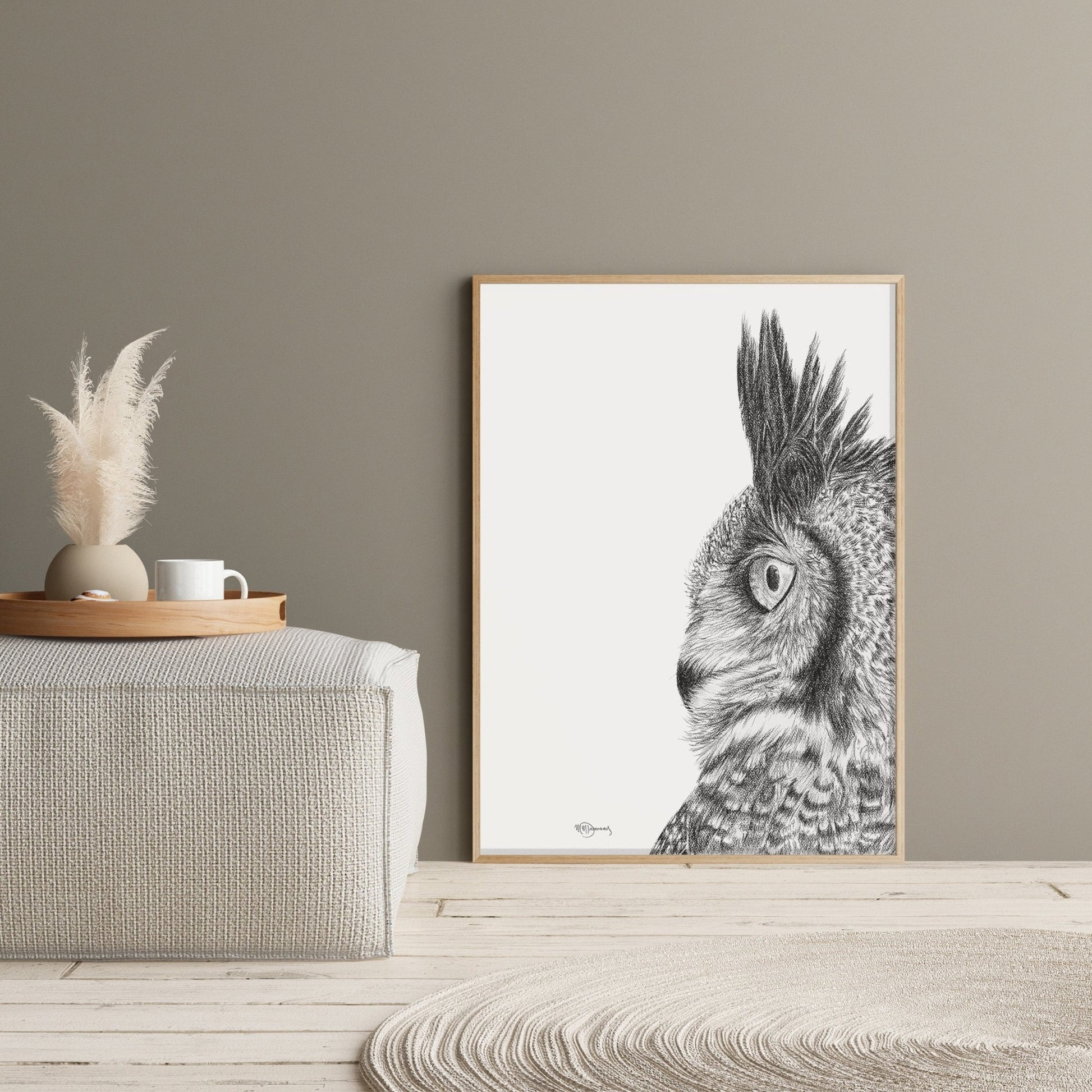 It is said that a successful living room or bedroom wall decoration is one that reflects who you are. This great horned owl illustration brings wisdom and intuition into your home.