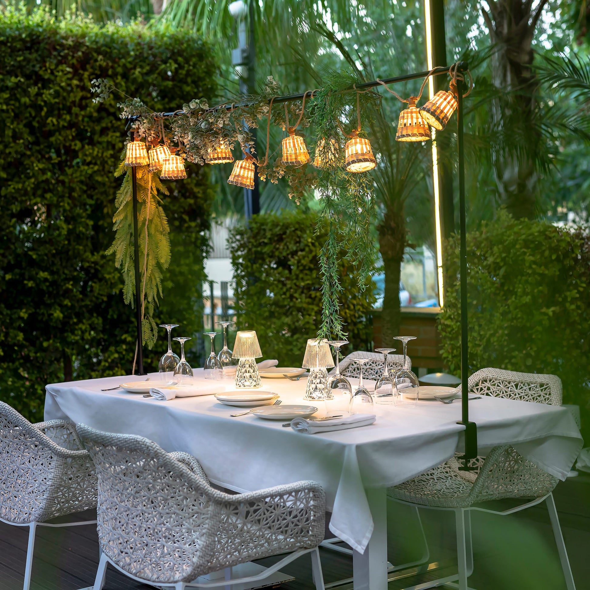 The Lola Lux table lamp adds a touch of elegance and style to any environment it illuminates. Crafted from durable, transparent polyamide, it boasts mirror-like accents that create a unique lighting experience. This lamp features adjustable brightness settings and a remarkable 50-hour battery life. The Lola model is the pride and joy of the Newgarden product line, renowned for its distinctive design and immense popularity throughout Europe, where it remains a top-selling product.