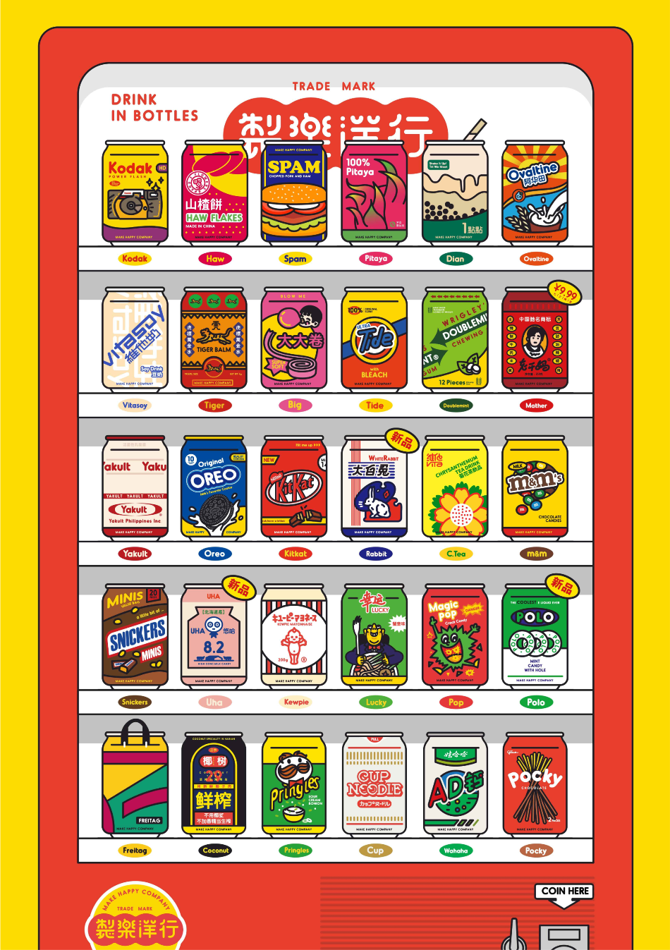 The vending machine. A ubiquitous sight in many Asian countries. Hot coffee. Booze. Noodles. Burgers. Hotdogs. Lemonade. Toys. Spaghetti. Fried Chicken. Let your imagination run wild. The offerings are endless. Designed by Chinese artist Lay Chen, “Make Happy Company” consists of 30 nostalgic “drinks”. This artwork is a playful exploration of what a drink might look and taste like from iconic childhood brands. Come along with us to discover this retro-inspired machine in the back alleys of Asia.
