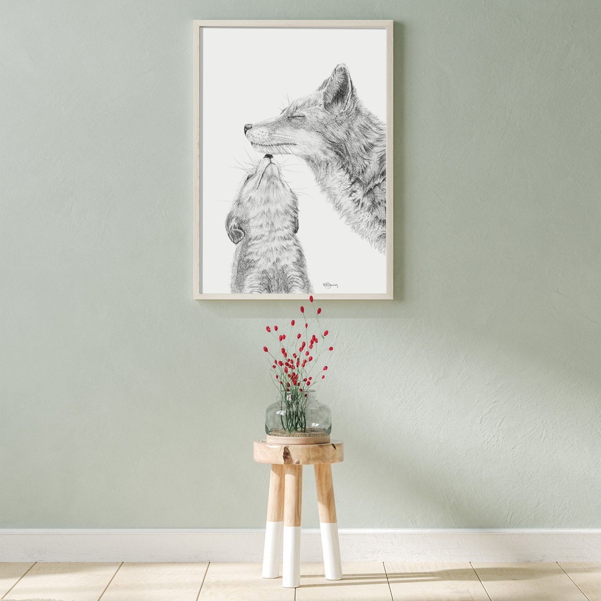 Discover my illustration of a mother fox and her baby, a true work of art, perfect as animal print for nursery or your own living room decor.