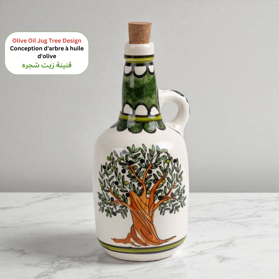 Handcrafted ceramic olive oil dispenser by Palestinian artisans, featuring beautiful hand-painted Olives and Flower designs. Durable glazed finish with an ergonomic handle for precise pouring.