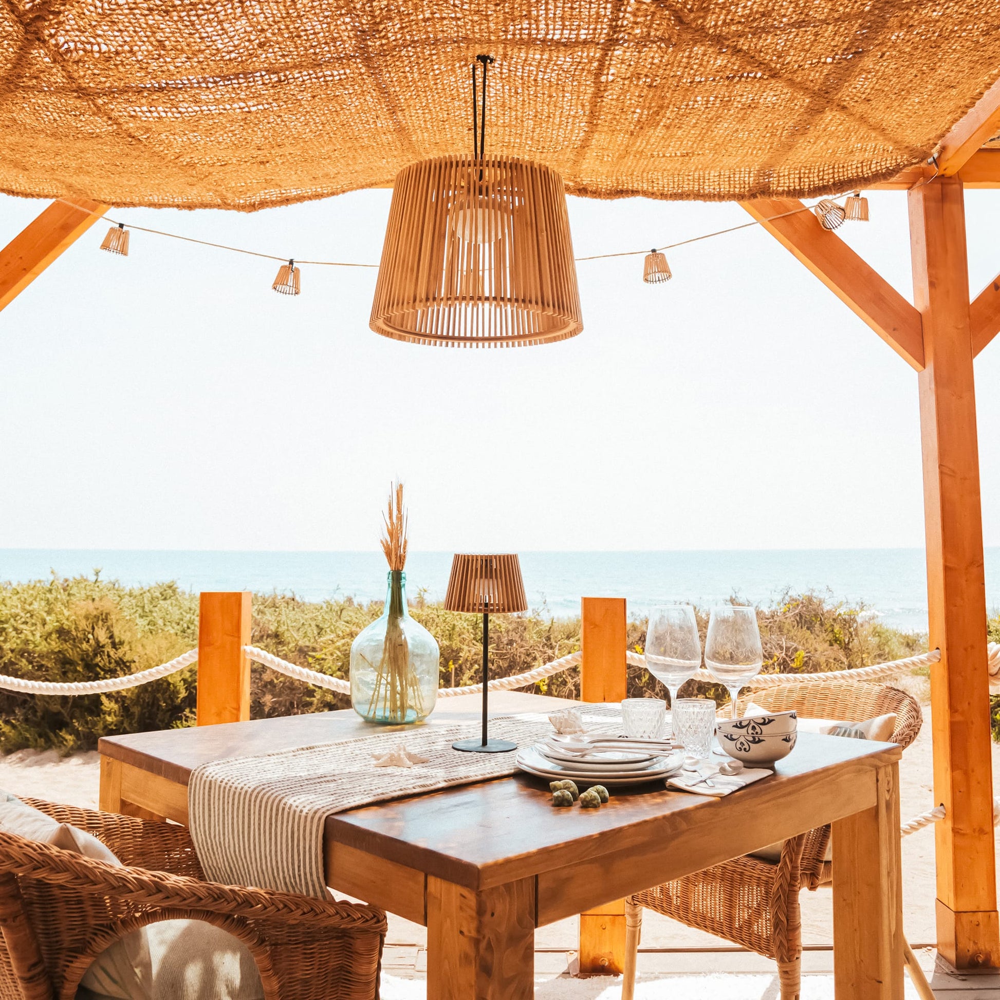 The Okinawa hanging outdoor pendant lamp by Newgarden is handmade from bamboo. Its organic design and flared shape with straight lines make it an indispensable product for any terrace or garden. It can be combined with other products from the Okinawa series such as the garland, the lantern (Okinawa Lantern) or the outstanding Okinawa floor lamp. All of them form a set of lamps that bring a touch of harmonious nature to your home.