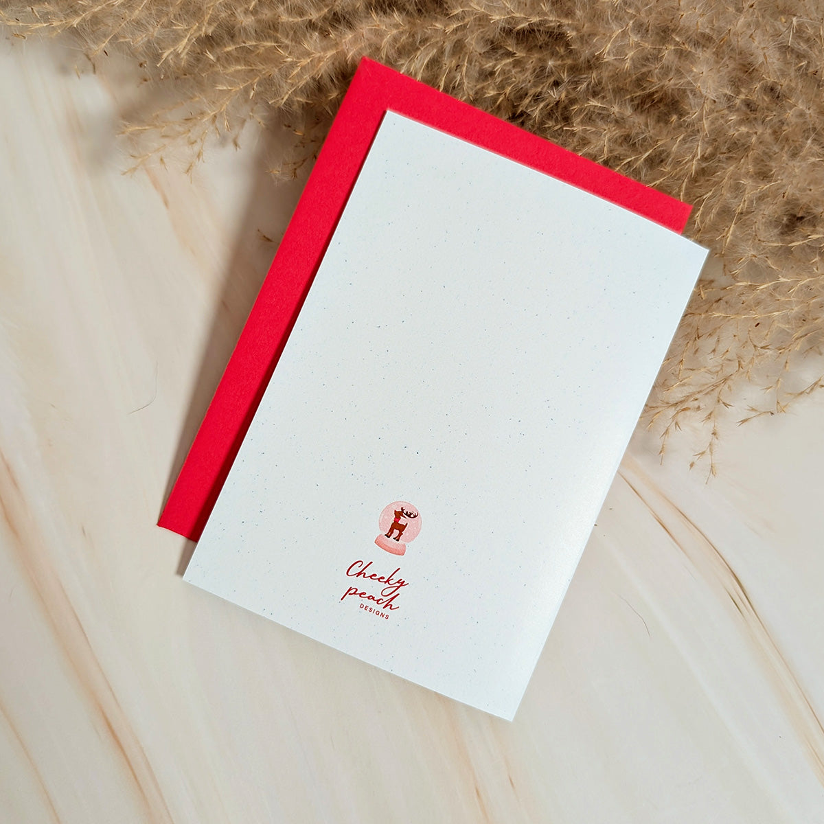 Rein in the holiday cheer with this delightful snow globe card, featuring a reindeer nestled inside a winter wonderland. Perfect for spreading festive joy to those who love all things merry and bright. Blank inside for your personalized message.