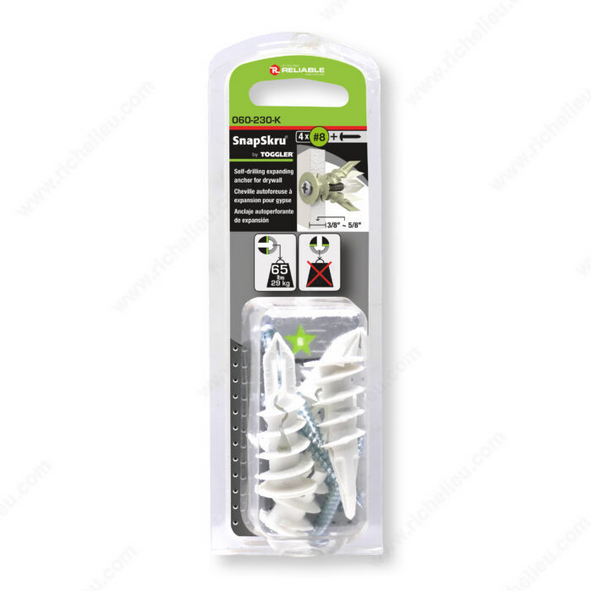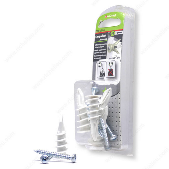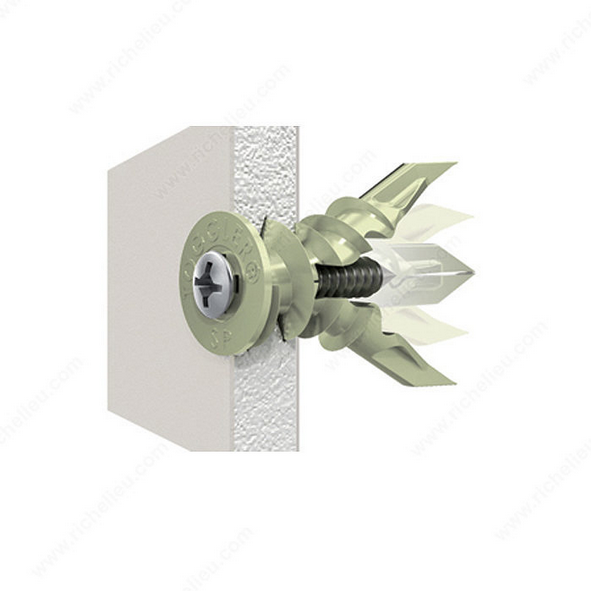 These self-drilling plastic dowels for drywall between 3/8 in (9.53 mm) and 5/8 in (15.88 mm) thick are easy to use and suitable for most types of #6 to #10 screws.