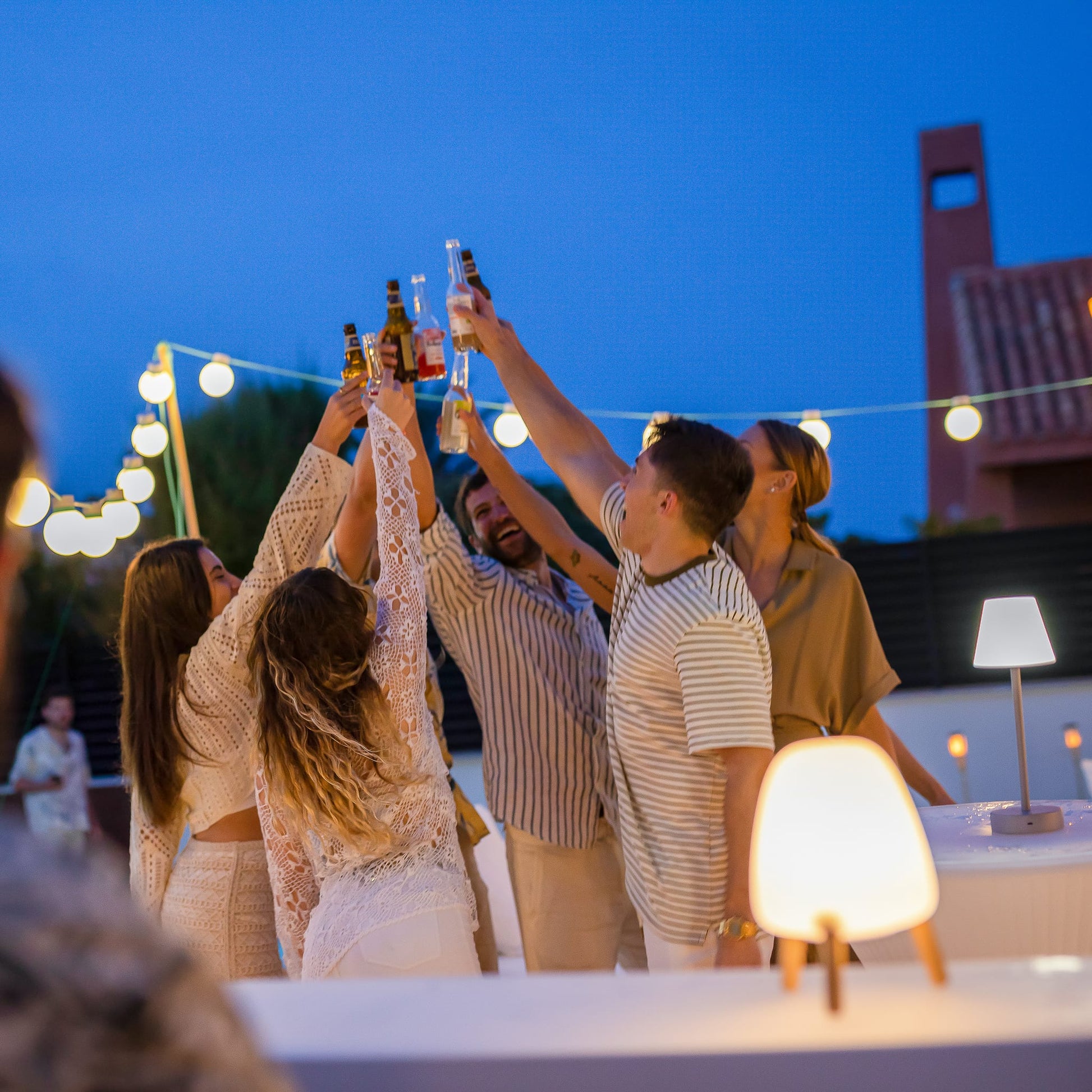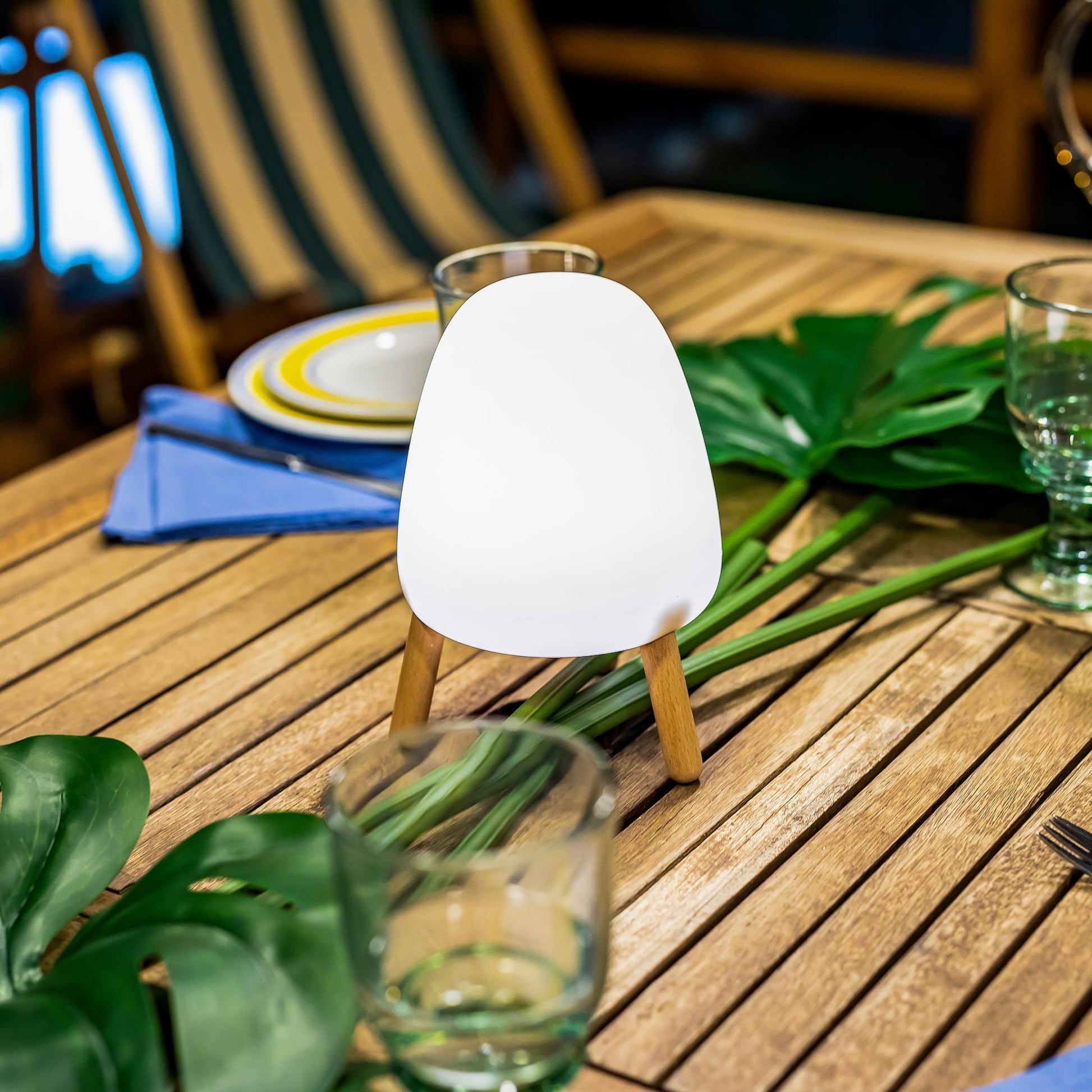 Rocket 20 by Newgarden is an original table lamp with wooden legs, ideal for decorating both exterior and interior spaces. Its combination of wood and polyethylene makes this product a must inside your home. Available for indoor and outdoor use, which includes a remote control with an intensity dimmer to change temperature and light colour.