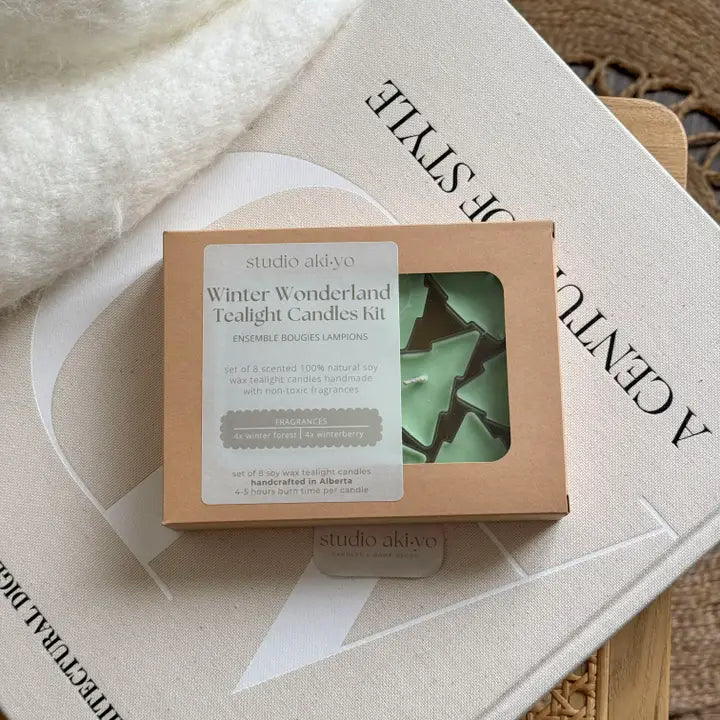 Bring the cozy magic of the season into your home with these winter-themed green tree shaped tealight candles. Each set includes a total of 8 candles in festive shapes and scents: Winter Forest and Winterberry. Perfect for holiday gifting, decorating, or creating a warm, inviting atmosphere all winter long. SCENT PROFILES Winter Forest; Natural sweetness of fresh and woody scent. Winterberry; Let the smell of a cold, winter day invigorate your senses. All of our creations are mindfully handmade in our studio located in Edmonton, Alberta and gives back to mental wellness. 〰 Product Details 〰 Set of 8 green tree tealight candles: 4x winter forest / 4x winterberry • Box of 8 0.5oz candles and up to 4 hours burn time each • Made from 100% biodegradable natural soy wax, lead-free & zinc-free natural cotton wick & fragrances that are non-toxic (paraben & phthalates free) • Natural, Vegan, Cruelty-free, Non-Toxic • Handcrafted in Alberta, Canada