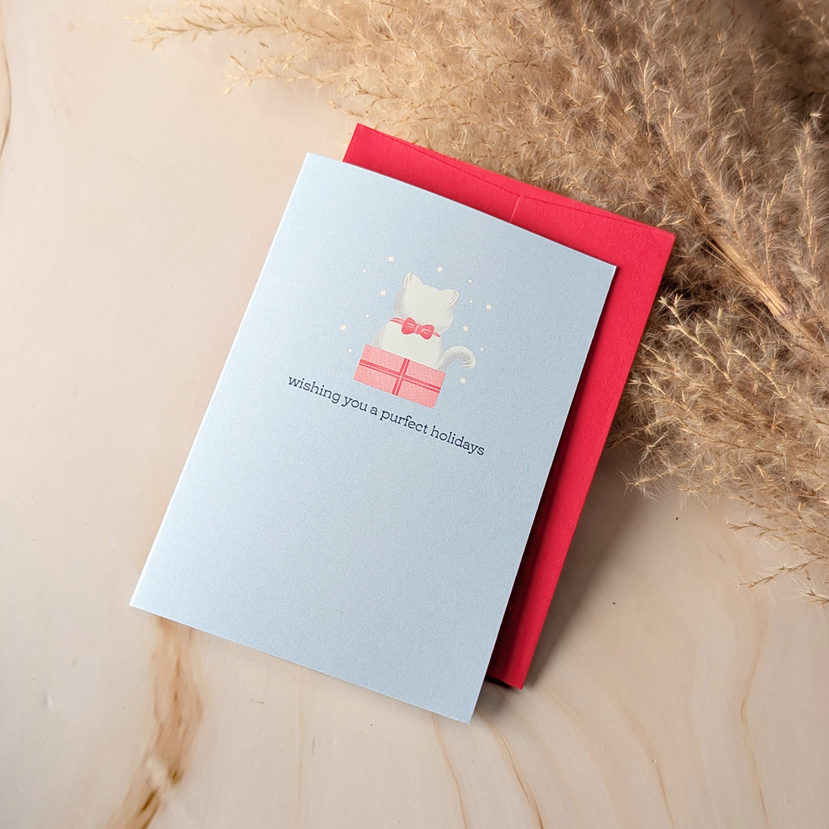 Send the purrfect holiday greeting with this Wishing You a Purrfect Holidays Mini Cat Card, featuring a cozy holiday scene with white or grey cat sitting in a festive box. This charming illustrated card is ideal for friends, teachers, and loved ones alike. With a blank inside, you have all the space you need to write a heartfelt holiday message.