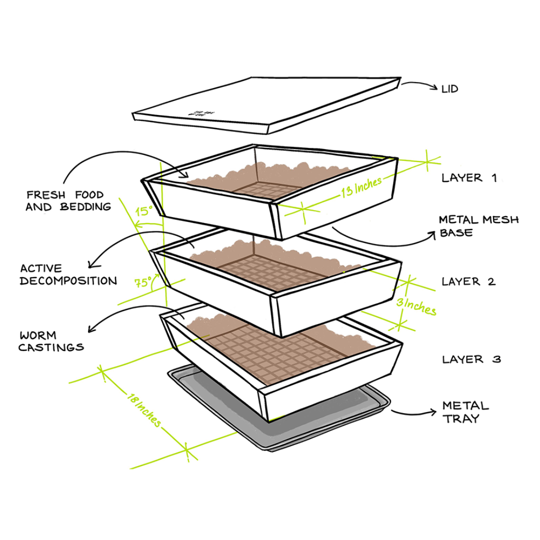 The Worm Studio has three stackable layers. As you feed the worms, they naturally migrate upward, leaving finished compost (castings) in the bottom layer for easy harvesting.